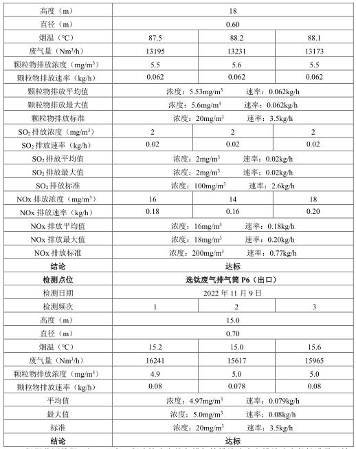根据监测数据可知,现有工程选钛生产线各排气筒排放浓度和排放速率能够满足《铁矿采选工业污染物排放标准》(GB28661-2012)表 5 中大气污染物排放浓度限值、《区域