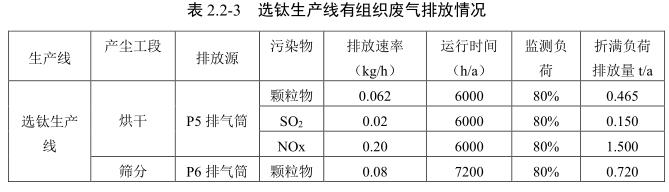 选钛生产线有组织废气排放量按照现有监测数据计算给出,各排气筒涉及的产尘工序粉尘产生、处理及排放情况见表 2.2-3。